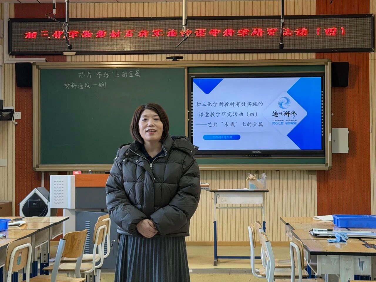 通州区第六中学冯月雪老师展示《从金属性质到电子转移——芯片布线的化学探究》第二课时,以芯片精准布铜为核心问题,引导学生对焊接布铜方案进行猜想与证伪,进而聚焦“通过化学反应实现铜定向沉积”的探究方向。课堂筛选出铁与硫酸铜的核心反应,提炼置换反应概念、讲解金属活动性顺序规则,通过分组探究和演示实验,让学生完整经历“理论预测—实验验证—结论总结”的科学探究过程。关联芯片工业布铜工艺,让学生建立“化学反应应用需结合实际场景”的认知,强化知识迁移能力。